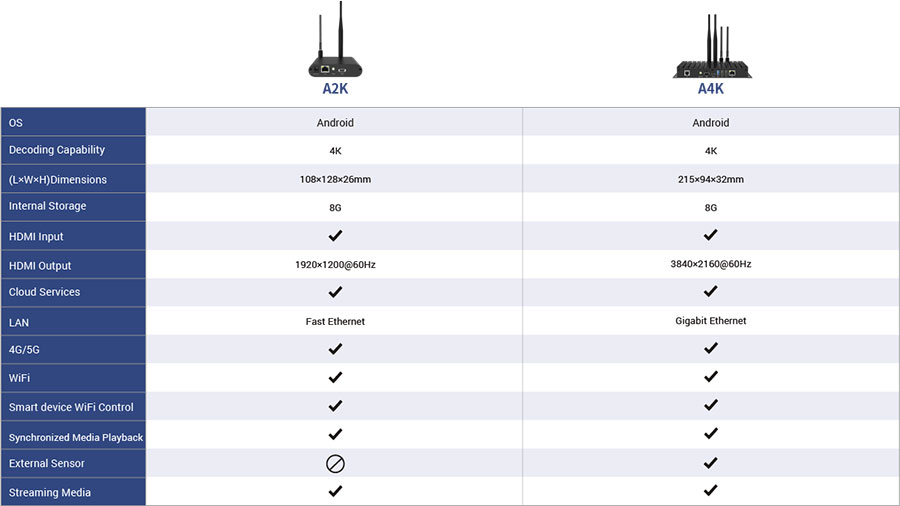 • Colorlight A4K is a cloud networking player that supports 4K VP9 and H.265/H.264 video decoding and 4K@60Hz output.