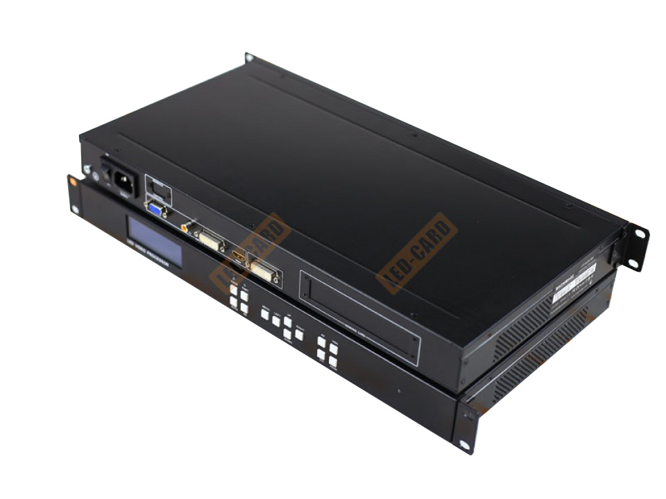 LED-500B is a mini video processor. It has numerous input and output plugs, including AV, DVI, VGA, HDMI,
