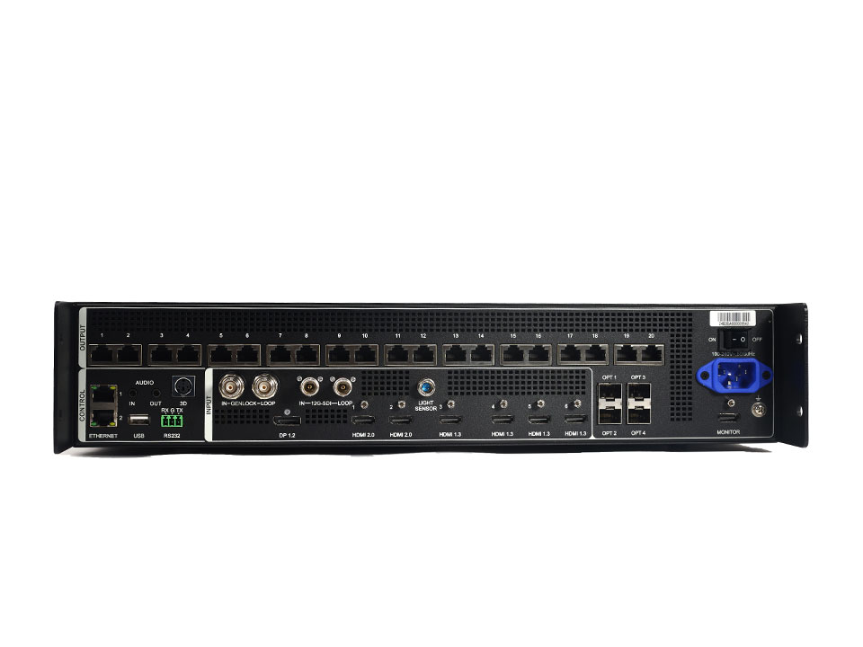 1x DP 1.2 / 2x HDMI 2.0 / 4x HDMI 1.3 / 2x 10G optical fiber port (OPT 1 & OPT 2) / 1x 12G-SDI (IN & LOOP) / 1x USB 3.0 (Play images or videos saved in a USB drive.)